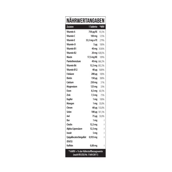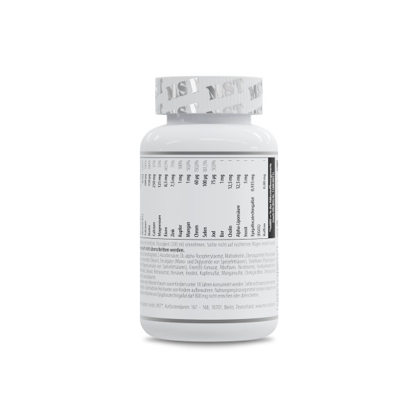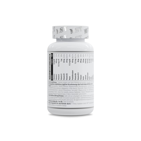 MST® Vitamin Kick – це якісний та ефективний вітамінно-мінеральний комплекс, доповнений альфа-ліпоєвою кислотою, екстрактом листя зеленого чаю, екстрактом журавлини, спіруліною, інозитолом, порошком плодів гіркого апельсину та лікопеном. Добре підібрані пропорції – більшість вітамінів по 100% від добової норми. Повний набір вітамінів та мінералів у великих дозуваннях, які необхідні професійним спортсменам та активним людям. Потужний, дуже повний, збалансований вітамінно-мінеральний комплекс зроблений спеціально підтримки організму при великих фізичних навантаженнях. Усі складові підвищують витривалість, тонізують та надають сил, допомагають підвищити життєвий тонус, скорочують втомлюваність та втому. ОСОБЛИВОСТІ MST® Vitamin Kick: – вітаміни С, Е, та А – антиоксиданти, а також мікроелементи цинк, селен та мідь сприяють захисту клітин від окисного стресу, який часто призводить до виникнення пухлинних процесів; вони уповільнюють старіння організму і допомагають довго зберігати шкіру гладкою та пружною; – кальцій та вітамін D необхідні для зміцнення кісткових тканин організму, включаючи хрящі, суглоби та зуби; – біотин бере активну участь у діях обміну білка, жирів та вуглеводів, є джерелом сірки, необхідної для синтезу колагену, важливого для здоров'я суглобів; – цинк є потужним антиоксидантом, запобігає процесам окислення ліпідів та захищає, таким чином, клітинні мембрани від активних форм кисню; забезпечує нормальну діяльність підшлункової залози, без нього неможливий синтез інсуліну, позитивно впливає на пам'ять, сприяє засвоєнню вітаміну А, необхідного для підтримки зору; - залізо та мідь відповідають за гемоглобін, сприяють зниженню втоми, покращенню здоров'я мозку та очей, зміцненню кісток та суглобів, підтримці репродуктивної функції; - Вітаміни групи В допомагають виробляти ферменти, що відповідають за обмінні функції в організмі і сприяють нормальному енергетичному обміну; ⠀ - вітамін Д3 забезпечує нормальний ріст та розвиток кісток, шляхом регуляції мінерального обміну, сприяє м'язовому тонусу, підвищує імунітет, необхідний для функціонування щитовидної залози та нормального згортання крові; - ALA (Альфа-ліпоєва кислота) допомагає кращому засвоєнню інших вітамінів, таких як вітаміни С та Е. Також цю кислоту активно приймають бажаючі схуднути або ті, хто контролює свою вагу в нормі, вона регулює жировий метаболізм і обмін холестерину, притуплює почуття голоду і посилює розпад глюкози в енергію. Як сильний антиоксидант Альфа-ліпоєва кислота посилює дію інших антиоксидантів, бореться з проявами старіння, захищає клітини від окислення, покращує пам'ять та мозкову діяльність. - інозитол разом з альфа-ліпоєвою кислотою покращує інсулінорезистентність, знижує рівні холестерину та тригліцеридів, підтримує здоровий гормональний баланс; - Біотин входить до складу ферментів, що регулюють обмін білків, жирів і вуглеводів, є джерелом сірки, необхідної для синтезу колагену, важливого для здоров'я суглобів; - мінерали (хром, марганець, кремній, йод, селен) допомагають у підтримці здорових кісток та зубів, а також сприяють кращому засвоєнню вуглеводів, білків та жирів; відповідають» здоров'я всієї сполучної тканини, тобто. за стан шкіри, волосся, нігтів, пружність стінок артерій та вен; - спіруліна (синьо-зелена мікроскопічна водоріс