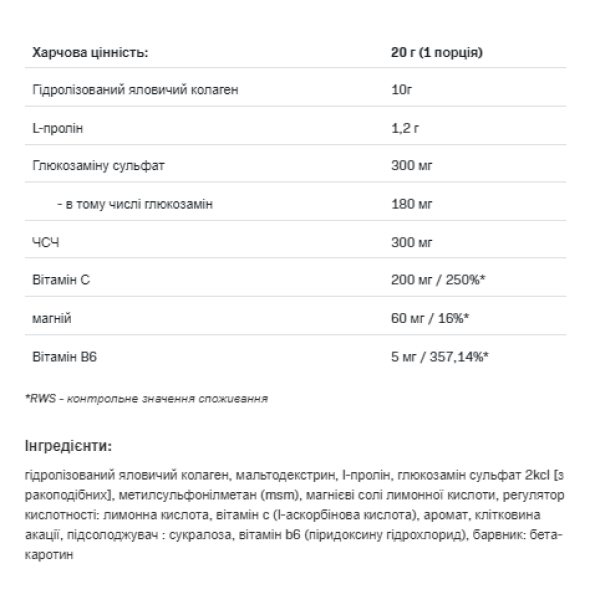 Переваги Flex All Complete профілактика від травм суглобів, хрящів, сухожиль, зв'язок; прискорює загоєння після травми; покращує рухливість суглобів; не містить барвників; містить лише перевірені та безпечні інгредієнти. Опис до Flex All Complete Flex All Complete – харчова добавка, основним інгредієнтом якої є гідролізований колагеновий білок, що підтримує здоров'я кісток, хрящів та суглобів. Цей вид білка становить основу сполучної тканини організму (сухожилля, кістка, хрящ тощо) і забезпечує її міцність та еластичність. Крім того, Flex All Complete доповнений рядом допоміжних компонентів, таких як глюкозамін, магній, метилсульфонілметан, вітамін С, які сприяють належному засвоєнню колагену. Склад Flex All Complete Розмір порції: 1 совок (20 г) Склад на порцію % Д.М. Калорії 59 Жири 0 г Насичені жири 0 г Вуглеводи 5,8 г Цукор 1,6 г Клітковина 0 г Білок 9 г Сіль 0 г Гідролізований колаген 10000 мг L-пролін 1200 мг Глюкозамін сульфат 300 мг M0 3 Магній 60 мг 16% Вітамін В6 5 мг 357%