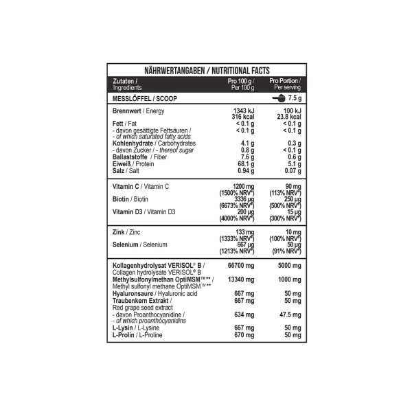 Пролін – амінокислота, яка сприяє покращенню шкіри та запобіганню старіння, зміцнює кістки, сприяє найшвидшому загоєнню ран та подряпин. Екстракт виноградних кісточок (Vitis Vinifera Seed Extract) – це спеціальний компонент, отриманий із насіння винограду. Його склад багатий на вітаміни А і Е, незамінні жирні кислоти і цілу низку інших корисних речовин, які і надають йому такі властивості. Він глибоко живить шкіру та сприяє швидкому загоєнню пошкодженої та сухої шкіри, зменшує запалення та набряк. У медицині та косметичній промисловості цей компонент набув найбільшої популярності завдяки своїм антиоксидантним властивостям. Його роль - захищати від руйнівної дії вільних радикалів біологічно активні речовини, які відповідають за омолодження організму. Вітамін С бере участь в обміні речовин та синтезі колагену. Біотин (він же вітамін B7) у складі бере участь в обміні речовин (входить до складу ферментів, що регулюють білковий, вуглеводний та жировий обмін) і позитивно впливає на ріст і будову волосся, нігтів, структуру шкіри та антиейдж-ефект. Biotin помітно покращує колір обличчя і робить шкіру більш пружною та шовковистою. Цинк - доведена добавка для покращення якості шкіри. Більшість дерматологів рекомендують при проблемах з висипом вугрів приймати додатково цинк. Він допоможе боротьбі з акне і, водночас, зміцнить імунітет. Сприяє підтримці високого рівня колагену в організмі, оскільки перешкоджає його руйнуванню вільними радикалами завдяки наявності у складі цинку і селену. Діючи разом, гідролізат колагену та вітамін С сприяють зміцненню та відновленню сполучної тканини, особливо після травм, операцій, різних захворювань суглобів, запобігають дегенеративним процесам у суглобах.Дія MST® Collagen Beauty Verisol® + OptiMSM Колаген Ананас | Нігті | Волосся | Шкіра 450 грамів: