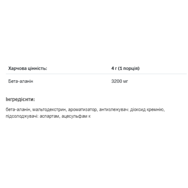 ALLNUTRITION - BETA ALANINE – це добавка на основі амінокислоти бета-аланіну з додаванням таурину та вітаміну B6 (для версії без смаку). Бета-аланін - органічна хімічна сполука з групи амінокислот. Це сильний попередник карнозину, який згладжує падіння pH, пов'язане, серед іншого, з утворенням молочної кислоти в м'язах при фізичному навантаженні. З цієї причини це відмінна добавка після тренування, яка впливає на регенерацію, знижує фізичну втому і має антикатаболічний ефект.