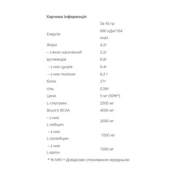 Кожен батончик містить 168 ккал, і завдяки своєму відмінному харчовому профілю, що містить менше 5 грамів жиру в батончику та лише 0,4 грама цукру, він ідеально підходить для тих, хто перебуває в період виправлення або на дієті для схуднення. Кожен батончик містить 4 грами амінокислот з розгалуженим ланцюгом (BCAA) у співвідношенні 2:1:1; оптимальне, клінічно перевірене співвідношення, яке нарощує м’язову масу.