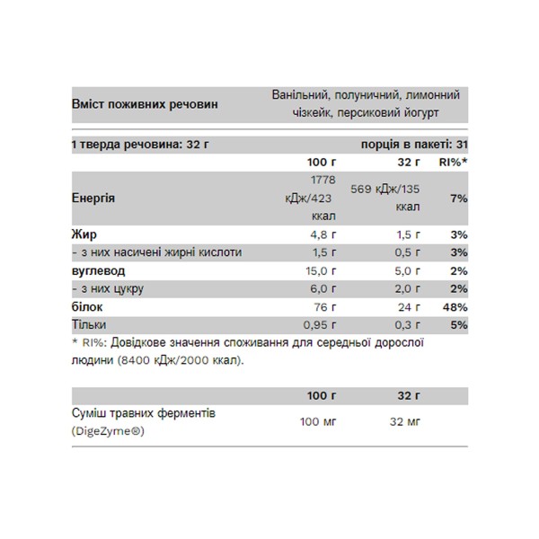 Інгредієнти (Шоколадний фундук): мікрофільтрований концентрат сироваткового білка (з молока, інстантизований соняшниковим лецитином), мікрофільтрований концентрат сироваткового білка (з молока, інстантизований соєвим лецитином), L-гліцин, сухе знежирене молоко, мальтодекстрин, какао-порошок зі зниженим вмістом жиру, ароматизатори (шоколадний смак, аромат лісового горіха), хлорид натрію, загущувач (ксантанова камедь), L-таурин, L-глутамін, підсолоджувачі (ацесульфам К, сукралоза), ферментний комплекс Digezyme® (альфа-амілаза, нейтральна) протеаза, целюлаза, лактаза, ліпаза)