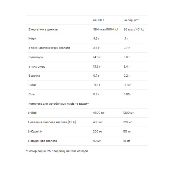 Посилений L-лізином, CLA, L-карнітином і гіалуроновою кислотою, він має ще більш позитивний вплив на процес схуднення та підтримку здоров’я шкіри, волосся та нігтів.