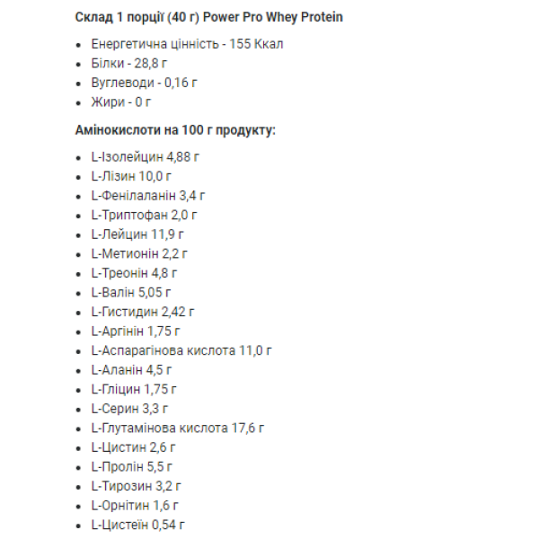 Whey protein зі смаком універсальна протеїнова матриця, яка містить унікальні рослинні речовини, комплекс вітамінів та мінералів, необхідних організму. Уявіть собі коктейль із стиглого, солодкого банана, незбираного молока та карамельного сиропу, збитого в м'якій пінки. Саме такий протеїновий коктейль приготувала компанія Power Pro для всіх ласунів та любителів екзотичного фрукта. Але на відміну від солодкого десерту, протеїновий коктейль не містить жиру та цукру. Коктейль допоможе витримати найжорстокішу дієту, за рахунок своєї солодощі та густоти. У протеїну пудроподібна текстура, яка повністю розчиняється, без грудок, перетворюючи будь-яку рідину на шовковистий, однорідний, неймовірно смачний і корисний коктейль. WHEY PROTEIN Power Pro класичний протеїновий коктейль з екзотичним смаком. Структура порошку дозволяє йому повністю, без грудок, розчинятися у звичайній воді. Ця властивість дозволяє використовувати протеїновий коктейль навіть при суворій дієті або сушіння. Одна порція, близько 2-х ст. л. суміші, розчинена у воді міститиме 28,8 г білка і всього 142,4 калорій. Всі отримані білки підуть на відновлення м'язів, тому що в протеїновій суміші немає важких молочних білків типу казеїну, які застоюються в шлунку. Коктейль складається з високоякісного голландського протеїну Friesland Campina DMV BV,, що швидко засвоюється, з трикомпонентною матрицею з ультрафільтрованого сироваткового концентрату, ізоляту і гідролізату сироваткових пептидів. Протеїновий коктейль не містить вуглеводів та жирів. Як регулятор обміну речовин і гарант здоров'я нирок при інтенсивному білковому харчуванні виступає льон. Льон - головне джерело жирних кислот омега-3. Омега-3 покращує функцію нирок, знижує рівень поганого холестерину, прискорює обмін жирів. Ще один цікавий побічний ефект покращення стану шкіри, нігтів та волосся. Роблять волосся блискучим і шовковистим. Зміцнити здоров'я допоможе швейцарський вітамінний комплекс DSM Nutritional Products Europe LTD, з цинком та селеном у своєму складі. Поки протеїн будує Ваші м'язи, селен і цинк відновлюють Ваші антитіла до простудних захворювань. Солодкий смак протеїну забезпечує відомий спортивний замінник на цукор ацесульфам. Ацесульфам відмінник серед цукрозамінників. Старанний, абсолютно нешкідливий та абсолютно некалорійний. Він визнаний суворими і манірними Англією та Німеччиною, спокійною Канадою та буйною Австралією. На даний момент це найкращий цукрозамінник.