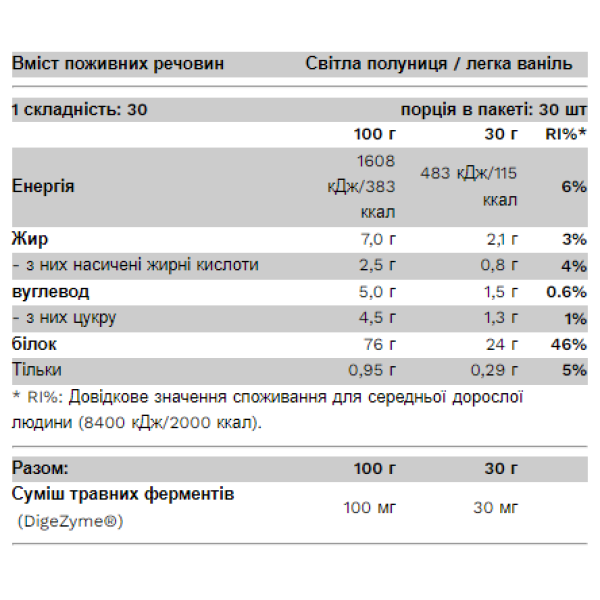 Інгредієнти (легка ваніль): концентрат сироваткового протеїну з перехресним мікрофільтром молока [емульгатор: соняшниковий лецитин], ароматизатори: ваніль; натрію хлорид, підсолоджувачі: ацесульфам-К, сукралоза; загущувач: ксантанова камедь; Суміш травних ферментів Digezyme® (альфа-амілаза, нейтральна протеаза, целюлаза, лактаза, ліпаза)