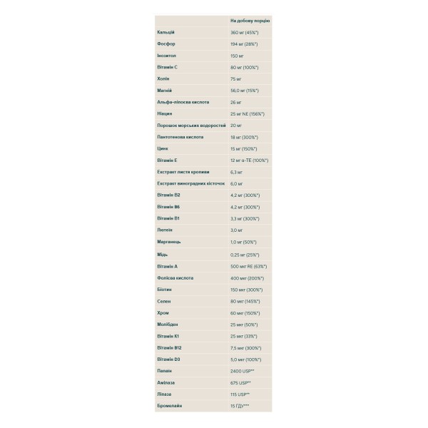 Alpha Men - супер мультивітамінна суміш, до складу якої входять унікальні та сильнодіючі вітаміни та мінерали, які є необхідними для здоров'я та благополуччя активного чоловіка. Цей сильний мультивітамін поєднує в собі найякісніші джерела кожного вітаміну і мінералу для того, щоб вважатися однією з найсильніших вітамінних сумішей на ринку. Фізичні вправи можуть порушити функціонування та здоров'я імунної системи, зробивши людину більш уразливою до травм чи хвороб. У зв'язку з цим життєво важливим для кожного, хто регулярно виконує фізичні вправи, є підтримка імунної системи на пікових рівнях з метою уникнення настання передчасної втоми та слабкості. Розроблена спеціально для унікальних поживних потреб чоловіків, суміш супер мультивітамінів Alpha Men є відмінним способом збільшити прийом вітамінів і мінералів, а також заповнити недоліки в нормальному харчуванні. Поряд із потужною сумішшю вітамінів і мінералів, Alpha Men містить безліч сильнодіючих антиоксидантів, включаючи екстракт виноградних кісточок, альфа-ліпоєву кислоту, цитрусові біофлавоноїди та бета-каротин. Ці інгредієнти відіграють важливу роль у боротьбі вашого організму з токсинами та вільними радикалами, виробленими під час вправи та активної життєдіяльності. Кожна порція також включає безліч інгредієнтів для того, щоб сприяти здоровій серцево-судинній системі (фолієва кислота і Гінкго Білоба), підвищеному виробництву енергії (корейський женьшень і кофермент Q10) і поліпшеному росту клітин (рибофлавін). Для збільшення засвоєння та функціонування цього мультивітаміну, ми використовували найбіодоступніші джерела інгредієнтів, а також безліч хелатних вітамінів та мінералів. Комплексні мультивітаміни, такі як Alpha Men, повинні бути частиною харчування будь-якого серйозного спортсмена. Ключові переваги Відмінна суміш вітамінів та мінералів вищої якості До складу входить сильнодіючі антиоксиданти для боротьби з токсинами та вільними радикалами. Життєво важлива суміш для здорової імунної системи. Кожна порція (2 таблетки) містить: 5мкг (200МЕ) Вітаміну E aTE (558% РДН*), 25мкг Вітаміну K (33% РДН*), 80мг Вітаміну C (100% РДН*), 12.5мг Вітаміну B1 (1136% РДН*), 12.5мг Вітаміну B2 (893 ), 25мг Ніацину NE (156% РДН*), 12.5мг Вітаміну B6 (893% РДН*), 400мкг Фолієвої Кислоти (200% РДН*), 125мкг Вітаміну B12 (5000% РДН*3), 1 ), 50мг Пантотенової Кислоти (833% РДН*), 25мг Калію (1.3% РДН*), 346мг Кальцію (43% РДН*), 140мг Фосфору (20% РДН*), 50мг Магнію (13% РДН*) (150% РДН*), 0.25мг Міді (25% РДН*), 1.5мг Марганцю (75% РДН*), 80мкг Селена (145% РДН*), 100мкг Хрому (250%РДН*), 25мк5 Молі РДН*), 25мг Холина, 50мг Екстракту Корейського Женьшеню (10:1) (рівне 500мг рослини), 25.5мг Альфа-Л іпоєвої Кислоти, 25.5мг Маточного Молока, 25мг Цитрусових Біофлаваноїдів (надаючи 8.75мг Геспередину), 20мг Бурої Водорості, 20мг Екстракту Гінкго Білоби (50:1) (Рівне 1000мг *)), 12.5мг Екстракту Зеленого Чаю (50:1) (рівне 625мг рослини), 12.5мг Інозітолу, 12.5мг Бромелаїну, 12.5мг Ліпази, 12.5мг Папаїну, 500мкг А5,5,5. , 6.25мг Екстракту Листя Кропиви (4:1) (рівне 25мг рослини), 6.25мг Екстракту Виноградних Кісточок (50:1) (рівне 312.5мг рослини). *Рекомендована Денна Норма