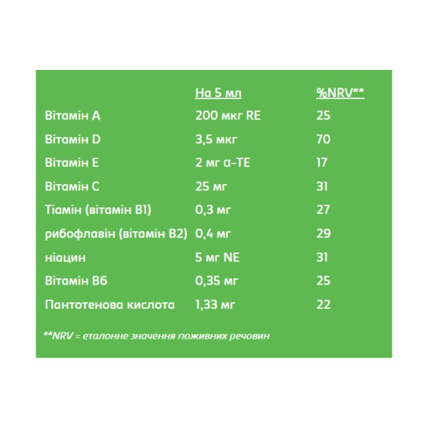 Вода, гліцерин, аскорбінова кислота, регулятори кислотності: цитрат натрію, лимонна кислота, стабілізатор: ксантанова камедь, ніацинамід, ароматизатор: апельсинова олія, хлорид натрію, консервант: сорбінова кислота, вітамін Е, D-пантенол, вітамін В2, препарат вітаміну А. (Вітамін A пальмітат, DL альфа-токоферол), вітамін B1, вітамін B6, вітамін D Prep. (Фракціонована рослинна олія, вітамін D, альфа-токоферол DL)