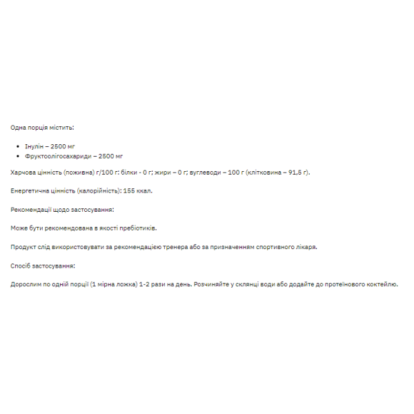 Інулін + фруктозо-олігосахариди (50:50) – пребіотик (не плутати з пробіотиками) у порошковій формі. Використовується для оздоровлення стравоходу, нормалізації мікрофлори слизової оболонки кишківника.