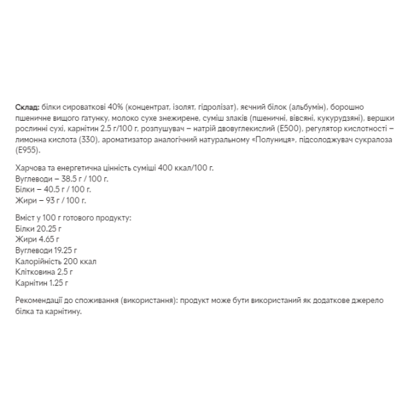 Протеїнова суміш для приготування мафінів містить 40.5% сироваткового білка й абсолютно не містить цукру! L-карнітин у складі є чудовим помічником під час схуднення. А неповторний смак полуниці з білим шоколадом полонить ваші рецептори назавжди.