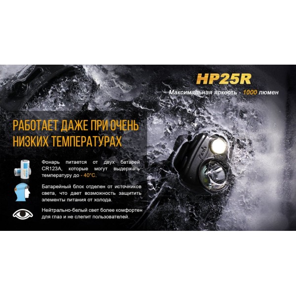 Модель Fenix HP 25R живиться від акумулятора розміру 18650. Він встановлюється в виносний блок, що допомагає не тільки рівномірніше розподілити навантаження, але і в разі необхідності, захистити відсік з акумулятором від холоду або інших небажаних факторів.