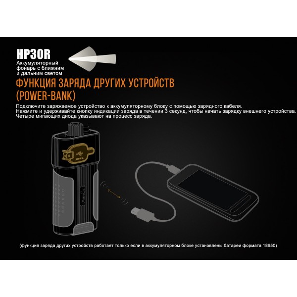 HP30R потребує для роботи в двох батарейках 18650, які містяться на зовнішній акумуляторний відсік. Для них доступна зручна функція індикації заряду, яка показує залишок енергії в п'яти позиціях: більше 80% - світяться 4 лампочки, 60-80% - три лампочки світяться, 40-60% - включаються дві лампочки, 20-40% - горить одна лампочка; до 20% - єдина з лампочок блимає. Для підзарядки потрібно встановити акумулятори в звичайний зарядний пристрій або ж підключити ліхтар до джерела енергії через micro-USB. А повністю заряджені акумулятори в батарейному блоці можна використовувати і для зарядки інших приладів, до числа яких відносяться смартфони. Для цього потрібно підключити кабель до роз'єму USB.