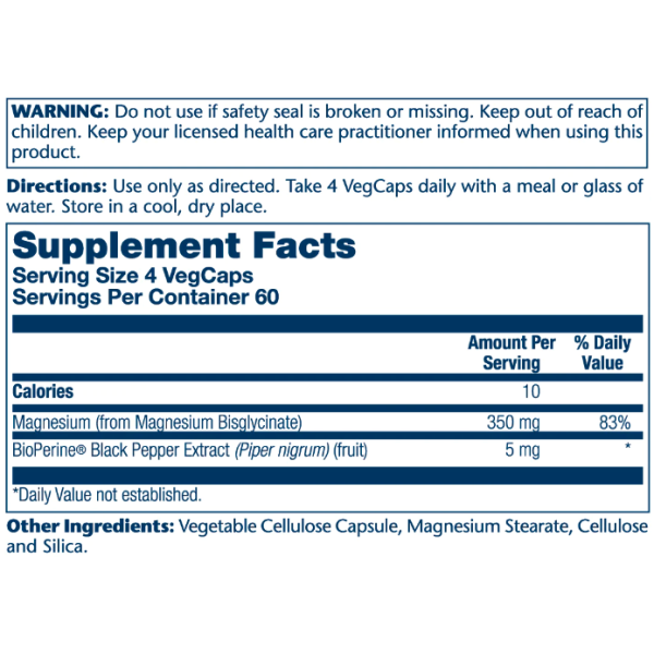Этот продукт содержит 350 мг магния в высокоусвояемой форме глицината. Магний - это важный минерал, который участвует во многих жизненно важных процессах в организме, включая производство энергии, функцию мышц и нервов, а также здоровье костей.