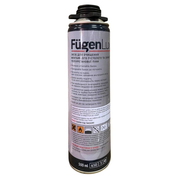 Очищувач монтажної піни «Fügenlux» - професійне, багатофункціональний засіб, що призначений для видалення не затверділих залишків і плям від поліуретанової піни та клею. Застосовується для чищення пістолета, клапана, балона і інших поверхонь. Швидко випаровується. Рекомендується для знежирення металевих поверхонь перед нанесенням силікону або поліуретану.