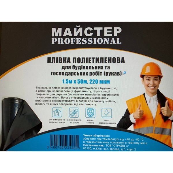 Будівельна плівка "Майстер Pro" – це високоякісний поліетиленовий матеріал, який забезпечує надійний захист будівельних конструкцій, матеріалів та інструментів від впливу вологи, пилу та забруднень. Вона ідеально підходить для будівельних і ремонтних робіт, захищаючи поверхні від пошкоджень і погодних умов. Основні характеристики: Розміри 1500 мм x 220 мкм – ширина плівки 1,5 метра та товщина 220 мікронів забезпечують достатню міцність для різних будівельних і ремонтних робіт. Довжина рулону 50 метрів – зручний у використанні розмір, який дозволяє накрити велику площу, зменшуючи кількість стиків і спрощуючи монтаж. Чорний колір – плівка ефективно поглинає сонячне світло, що знижує перегрівання поверхонь і створює додатковий захист від ультрафіолетових променів. Водонепроникність – ідеальна для захисту матеріалів і будівельних конструкцій від дощу, вологи та конденсату.Універсальне застосування – підходить для захисту будівельних майданчиків, тимчасового накриття покрівель, укриття матеріалів та створення тимчасових бар’єрів. Плівка "Майстер Pro" – це оптимальне рішення для професійних будівельників і майстрів, яке поєднує в собі високу якість і надійність. Вона забезпечує захист у будь-яких умовах, гарантує довговічність і зручність використання.