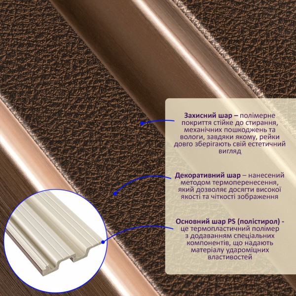 - Захисний шар – полімерне покриття стійке до стирання, механічних пошкоджень та вологи, завдяки якому, рейки довго зберігають свій естетичний вигляд.