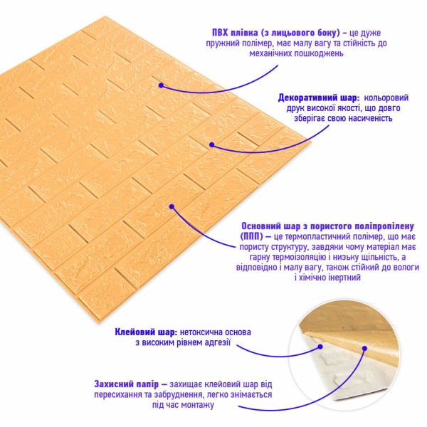 3D панелі самоклеючі – декоративне покриття для стін, виконане з легкого та міцного матеріалу – пористого поліпропілену (ППП). Основна особливість – рельєфний малюнок у вигляді цегли у широкому різноманітті кольорів та наявність клейового шару, що дозволяє встановити панелі без необхідності застосування додаткових матеріалів.