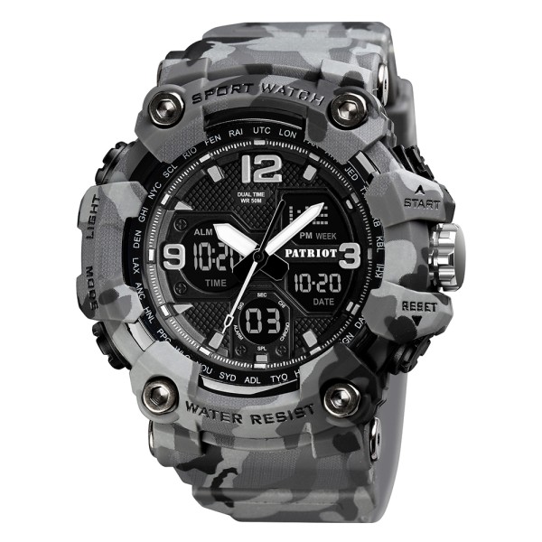Представляємо вам наручний годинник Patriot 006CMGY Camo Gray — ідеальне поєднання стилю та функціональності для активних чоловіків. Цей спортивний годинник має стильний корпус з полімера у сірому камуфляжному забарвленні, діаметром 50 мм, який надійно захищає кварцевий механізм.