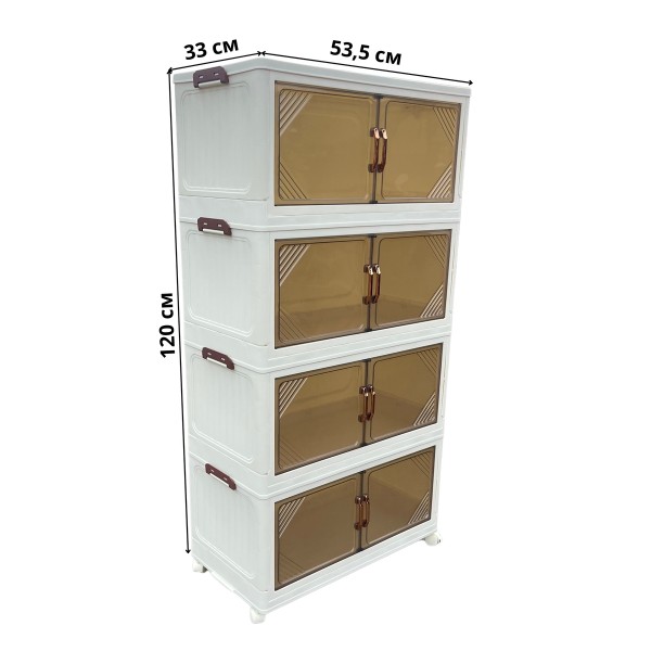 Пластикова шафа Home Star на 4 полиці – це практичне рішення для організації зберігання вдома, в офісі чи на дачі. Завдяки колесам із гальмами її легко переміщати, а дверцята на магнітах забезпечують зручність у користуванні та надійний захист вмісту. Основні переваги: Мобільність: Колеса з гальмами дозволяють без зусиль переміщати шафу в потрібне місце та фіксувати її там, де це потрібно. Місткість: Чотири просторі полиці ідеально підходять для зберігання одягу, взуття, побутових дрібниць, інструментів чи інших речей. Зручність у використанні: Дверцята з магнітами легко відкриваються та надійно закриваються, захищаючи вміст від пилу. Якісний матеріал: Виготовлена з міцного пластику, який не боїться вологи та стійкий до перепадів температур. Легкий догляд: Поверхню легко мити, що робить шафу ідеальною навіть для вологих приміщень. Де використовувати? У передпокої для зберігання взуття та аксесуарів, у ванній кімнаті для рушників і засобів догляду, на балконі чи в гаражі для зберігання інструментів або інших речей, у офісі для документів та оргтехніки. Пластикова шафа Home Star на 4 полиці – це поєднання практичності, мобільності та сучасного дизайну, що допоможе створити ідеальний порядок у вашому просторі!
